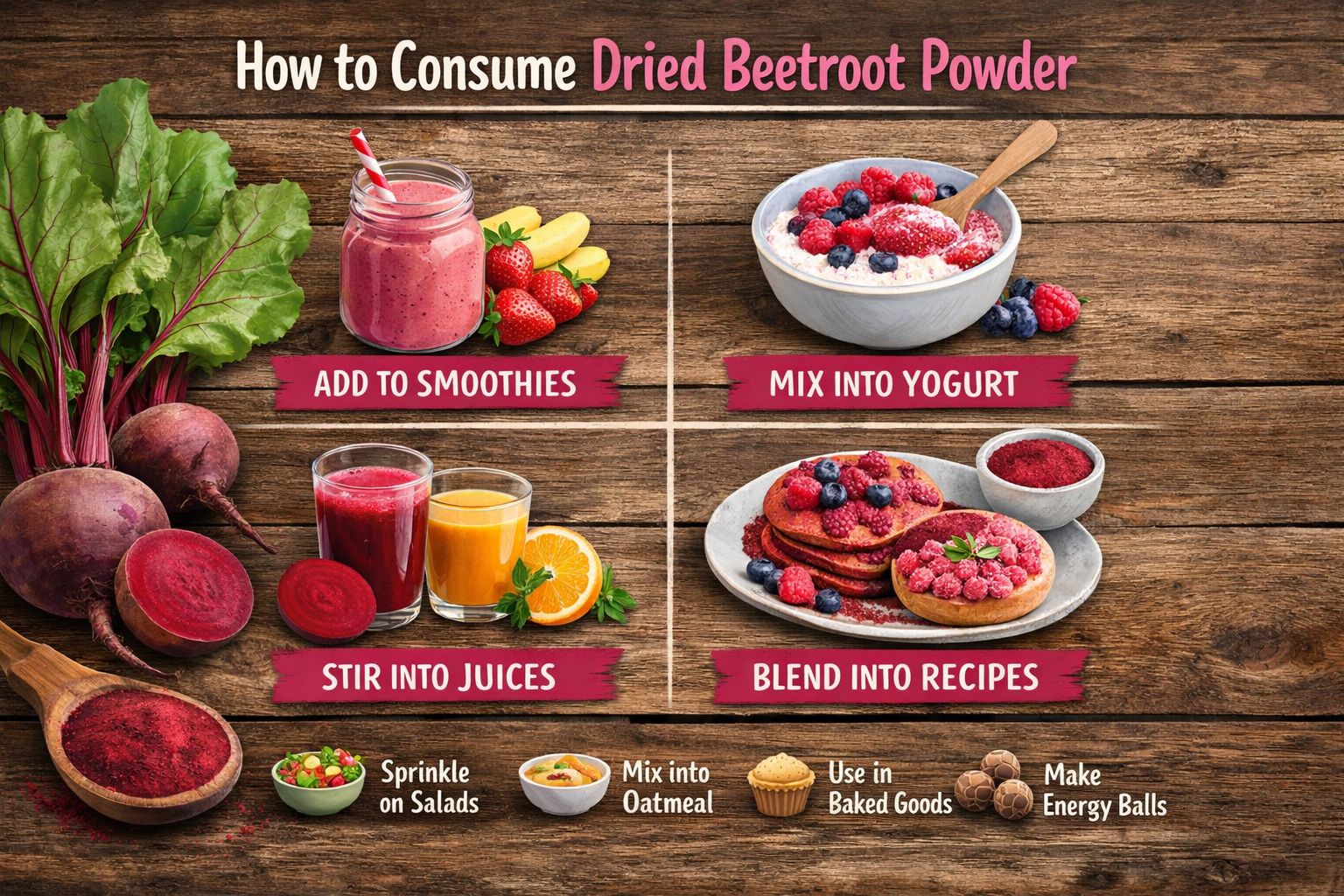 Mix a teaspoon of beetroot powder into your morning yoghurt, oatmeal, or porridge for an easy nutritional upgrade. Pair it with honey, nuts, or fresh fruit to balance the flavour and create a wholesome, filling breakfast.