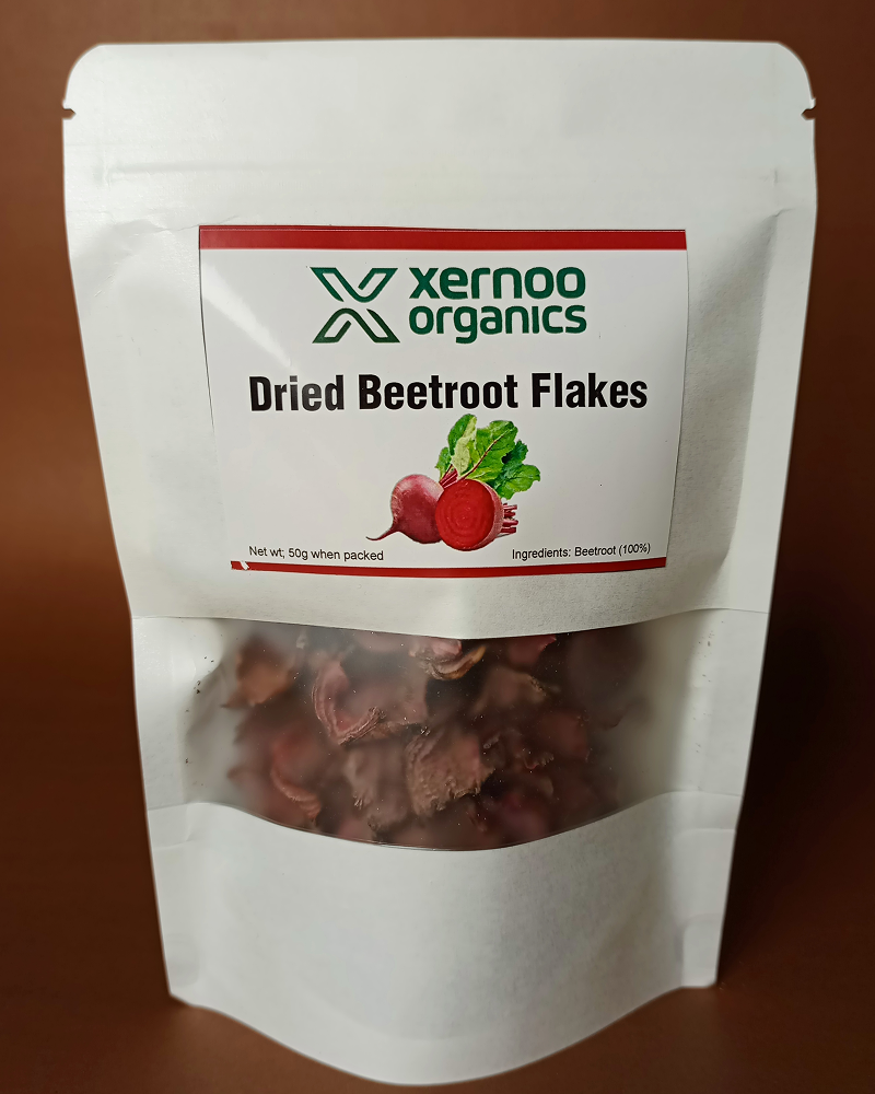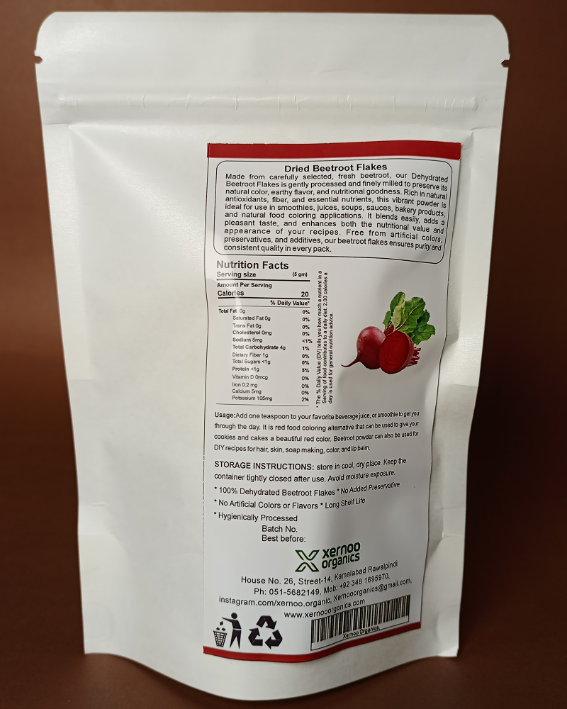 Xernoo Organics Dried Beetroot Flakes are made from 100% pure beetroot—carefully sliced, sun-dried, and packed to preserve their vibrant color, earthy sweetness, and nutritional power. These ruby-red flakes are a versatile superfood addition to soups, salads, smoothies, sauces, and even homemade skincare. With no additives or preservatives, they offer a wholesome way to boost flavor, color, and health in your daily routine.