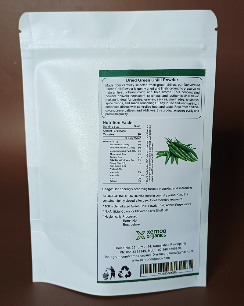 Xernoo Organics Dried Green Chilli Powder is a vibrant, finely ground spice made from 100% pure green chillies, sun-dried and milled to preserve their natural color, aroma, and heat. This zesty powder adds a fresh, fiery kick to your dishes—perfect for chutneys, marinades, pickles, and everyday cooking. Packed in a resealable pouch to lock in freshness, it’s a must-have for spice lovers who value purity and bold flavor.
