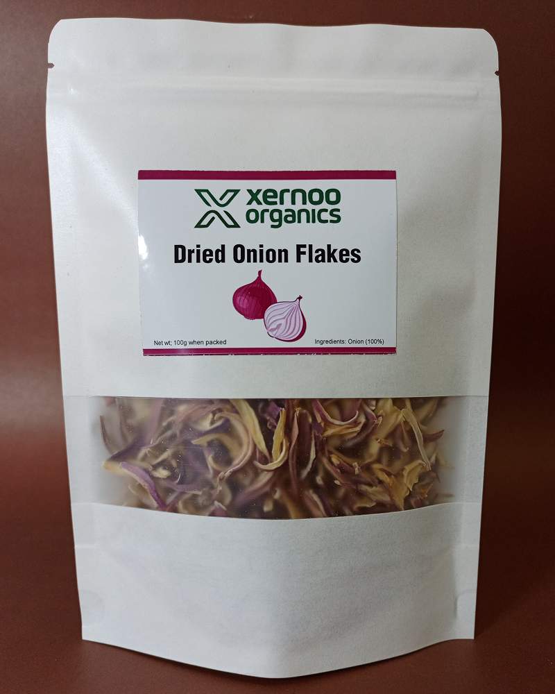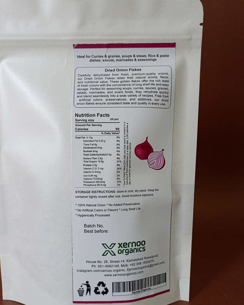 Xernoo Organics Dried Onion Flakes are carefully dehydrated from fresh, premium onions to preserve their natural flavor, aroma, and nutrition. Hygienically processed and free from additives, these flakes offer a convenient way to add rich onion taste to everyday cooking—without the tears or chopping.